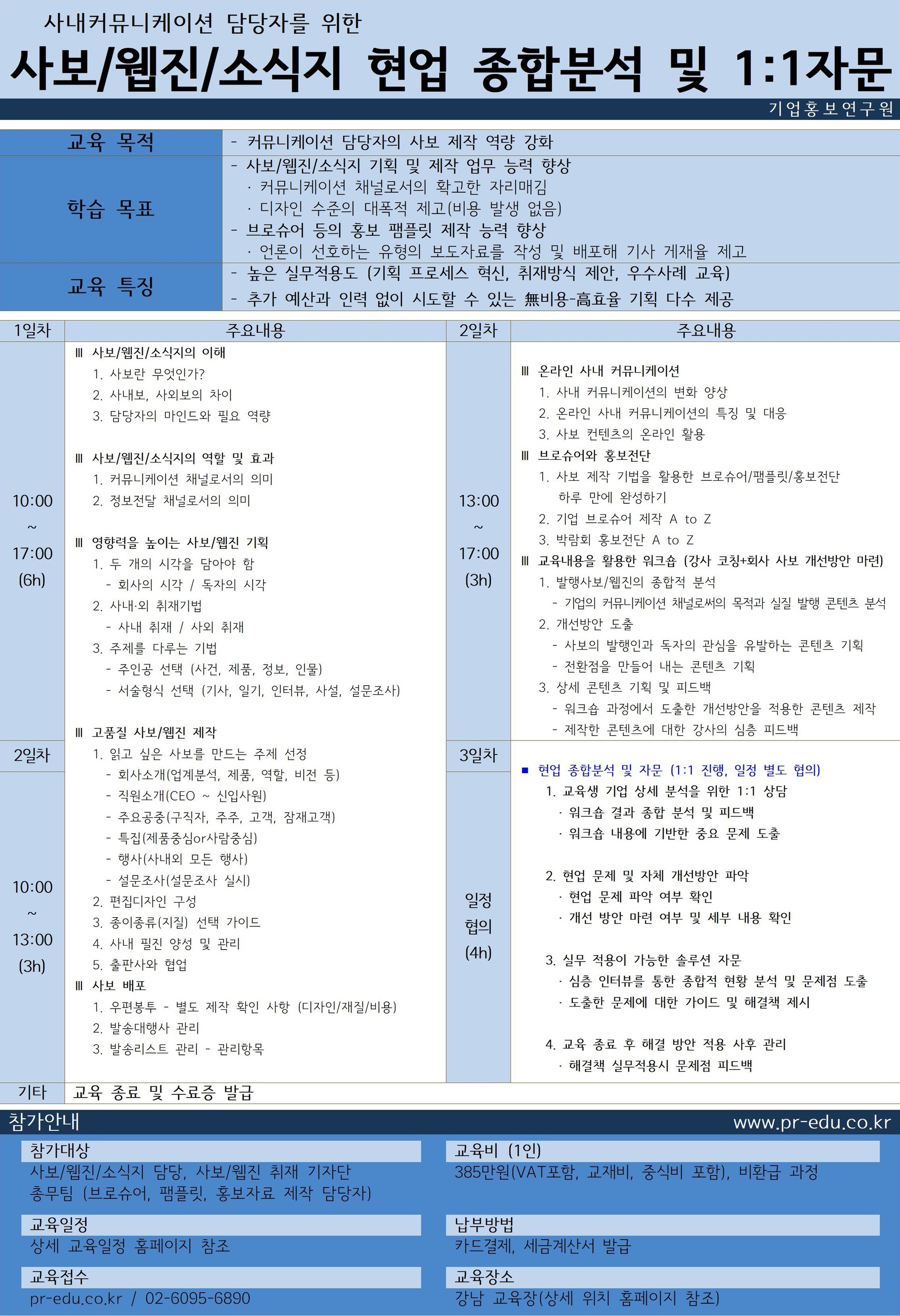 | 학습목표 | - 사보 기획 및 제작 업무 능력 향상 · 커뮤니케이션 채널로서의 확고한 자리매김 · 디자인 수준의 대폭적 제고(비용 발생 없음) - 브로슈어 등의 홍보 팸플릿 제작 능력 향상 · 언론이 선호하는 유형의 보도자료를 작성 및 배포해 기사 게재율 제고 |