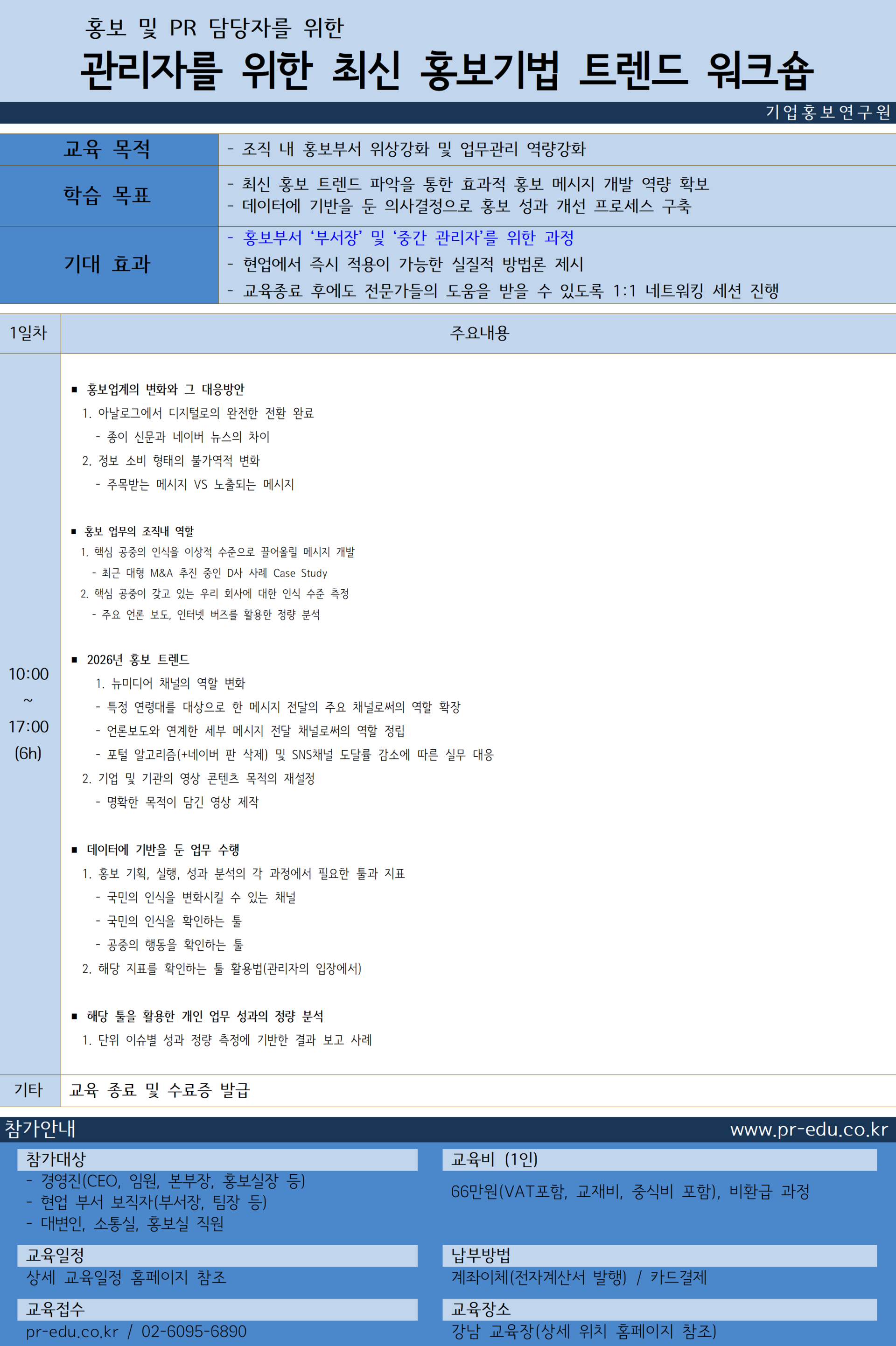 | 교육대상 | - 홍보부서장, 홍보부서 중간 관리자 - 홍보업무 無 경험 부서장 및 중간 관리자급 발령자 |